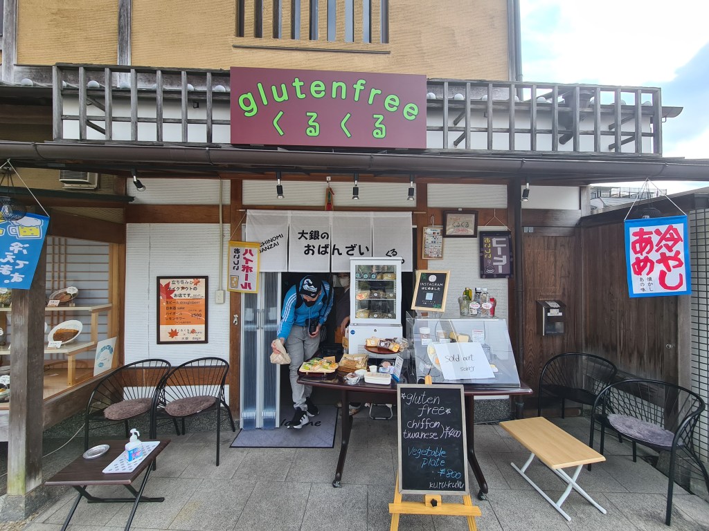 Primeramente les quiero recomendar el café restaurante Kurukuru, es pequeño pero puedes encontrar postres completamente sin gluten, comida típica japonesa pero hecha para celíacos, también venden cerveza. Es una excelente opción si necesitas comer algo rápido y seguro. La dueña es súper amigable y risueña, de hecho en mi estadía en kioto me hice fiel a sus galletas (que son excelentes) y un dia me recibió con un regalo el cual agradezco con todo mi corazón.